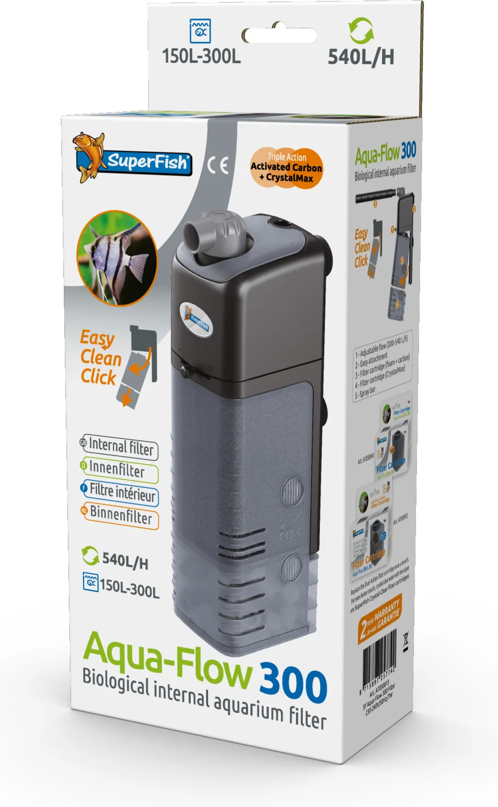 Aquarium filter Aqua-Flow 300 is het perfecte filter voor tropische en koud water aquaria van 150 tot 300 liter. De Aqua-Flow is voorzien van een sproeibuis, regelbare waterflow (behalve bij Aqua-Flow 50) en een gemakkelijk vervangbare Easy Clean Click cassette. Het Easy Clean clicksysteem maakt het reinigen van het filter eenvoudig, je vervangt de filtercassette in een handomdraai.